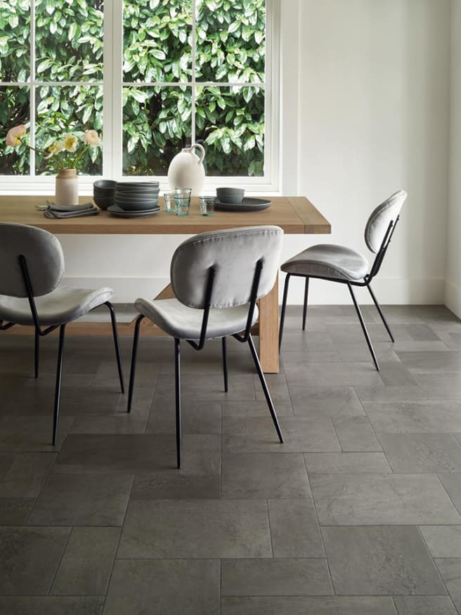 This naturally dramatic floor, featuring ashy tones, works beautifully when matched with lighter walls and natural furniture. By introducing a lighter colour palette such as off-white, grey or taupe, you can instantly brighten and open-up the room to balance the darker base. For any of our floors, when styling, we always recommend picking out key undertones within the flooring – here crockery, vases and even chair legs that share similarly dark grey hues complete the scheme.
