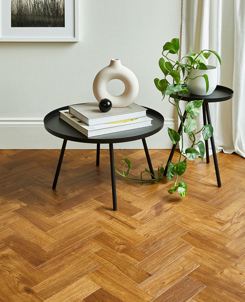 The contemporary, soft hues of these Limed Oaks bring freshness and gentle movement to any floor, and are perfectly enhanced by a parquet laying pattern.