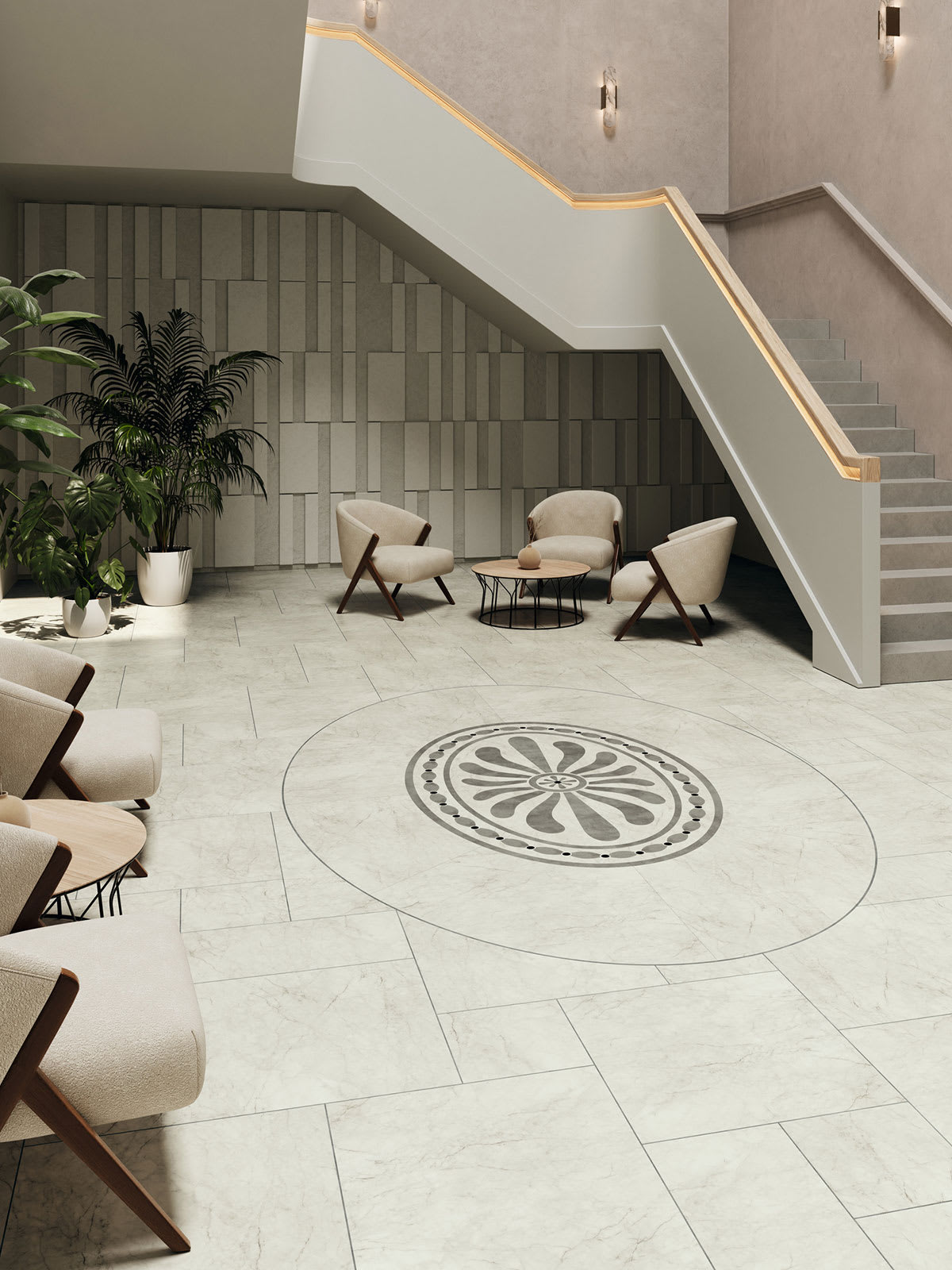 Incorporating a motif into a lobby, reception, or entrance space instantly creates a stunning focal point offering visual impact while paying homage to the elegance of traditional flooring design.
