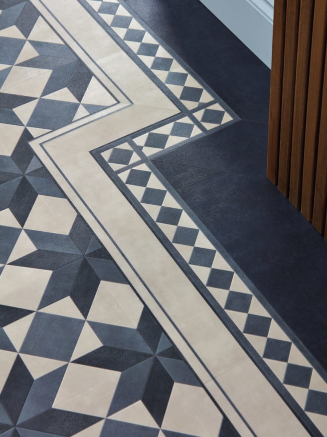 In the example below, Pinstripe Fine is paired with the striking Bevelled Diamond Border, with corners completed using the coordinating Bevelled Diamond Corner. A final perimeter tile draws from the rich colour palette of DC495 Victorian Star, seamlessly tying the whole design together for a cohesive and beautifully framed effect.