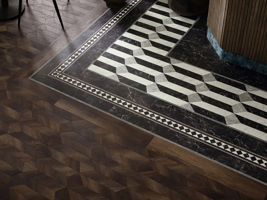 Venetian Parquet Nightshade DC614 with Venetian Parquet Stone DC615 with Bevelled Diamond Stripping.