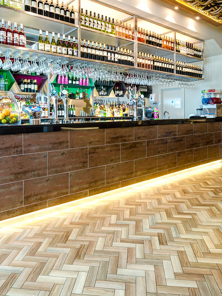 Amtico Signature products; Blonde Oak, Glint Orb, and Glint Void are used to zone areas of the restaurant.