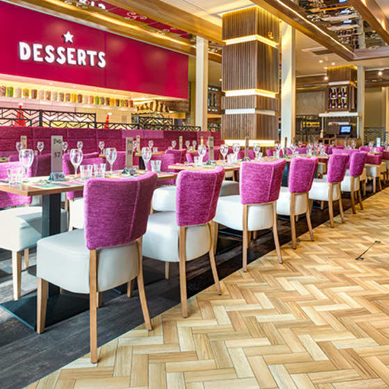 To reflect the diverse cuisine offering at FeD, the interior design team at Via Interiors, in Leeds, chose to zone the overall scheme, incorporating different design treatments, colours, materials and patterns for the flooring, ceiling, seating areas and live kitchen stations. Retro materials were also high up in the design brief as was statement flooring, successfully achieved with the black and white woven pattern. Contrasting with this retro look are four additional zones created by combining stone and wood designs in a complementary mix of laying patterns.