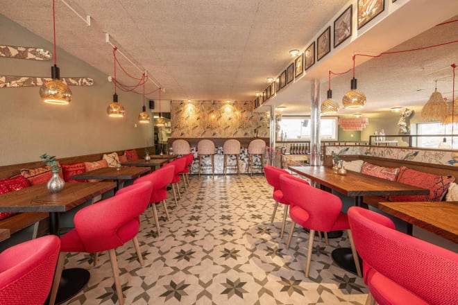 The restaurant features Stucco Opaline, Encaustic Okra and Diffusion Aloe in a Victorian Star laying pattern from Amtico Décor collection.