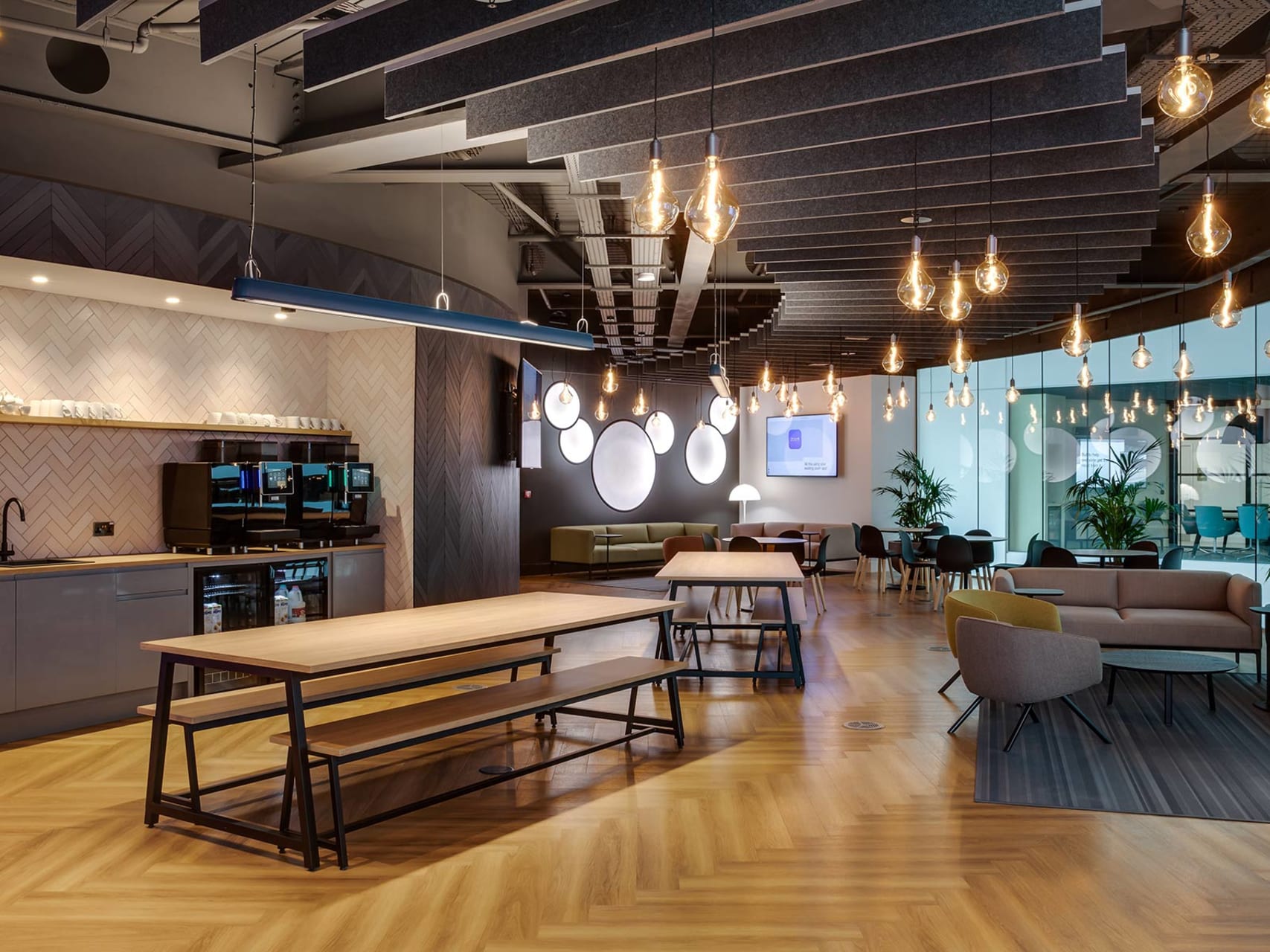 Honey Oak’s golden tones laid in a classic Herringbone pattern, adds character and warmth to the breakout space. Its rich hues create an inviting and relaxed environment, while the Herringbone pattern introduces visual interest.