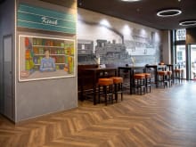 Un detalle destacado de diseño es la instalación personalizada del logo, trabajada con la máxima precisión directamente en el suelo. El emblema único de la cervecería atrae todas las miradas y refuerza la identidad de marca de forma impactante — una pieza única que demuestra la versatilidad creativa de los suelos Amtico.