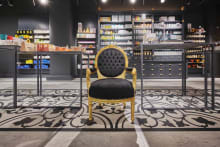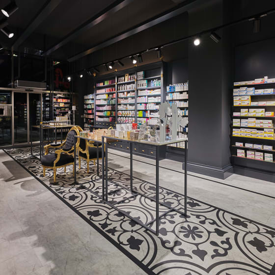 Para este proyecto, los expertos en CAD de Amtico realizaron un diseño personalizado que muestra un pavimento único, creado y ejecutado exclusivamente para la farmacia. En él se combinaron dos diseños contrastantes de la colección Amtico Signature, que funcionan como un fuerte anclaje visual y, al mismo tiempo, se integran perfectamente con la superficie de mármol claro adyacente.