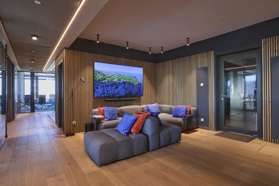 Ya sea en salas de reuniones, áreas de trabajo abiertas o en el acogedor lounge, el pavimento conecta las distintas zonas, creando un espacio uniforme, profesional y con estilo.