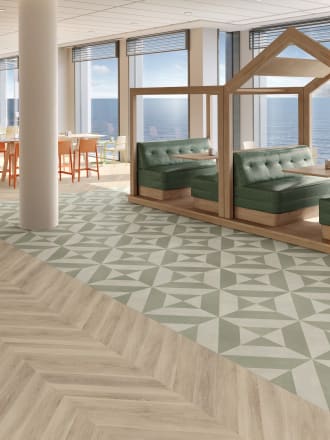 Los tonos verdes suaves y difuminados de Diffusion Aloe, junto a su textura punteada, crean un suelo moderno y chic, lleno de sofisticación y serenidad.