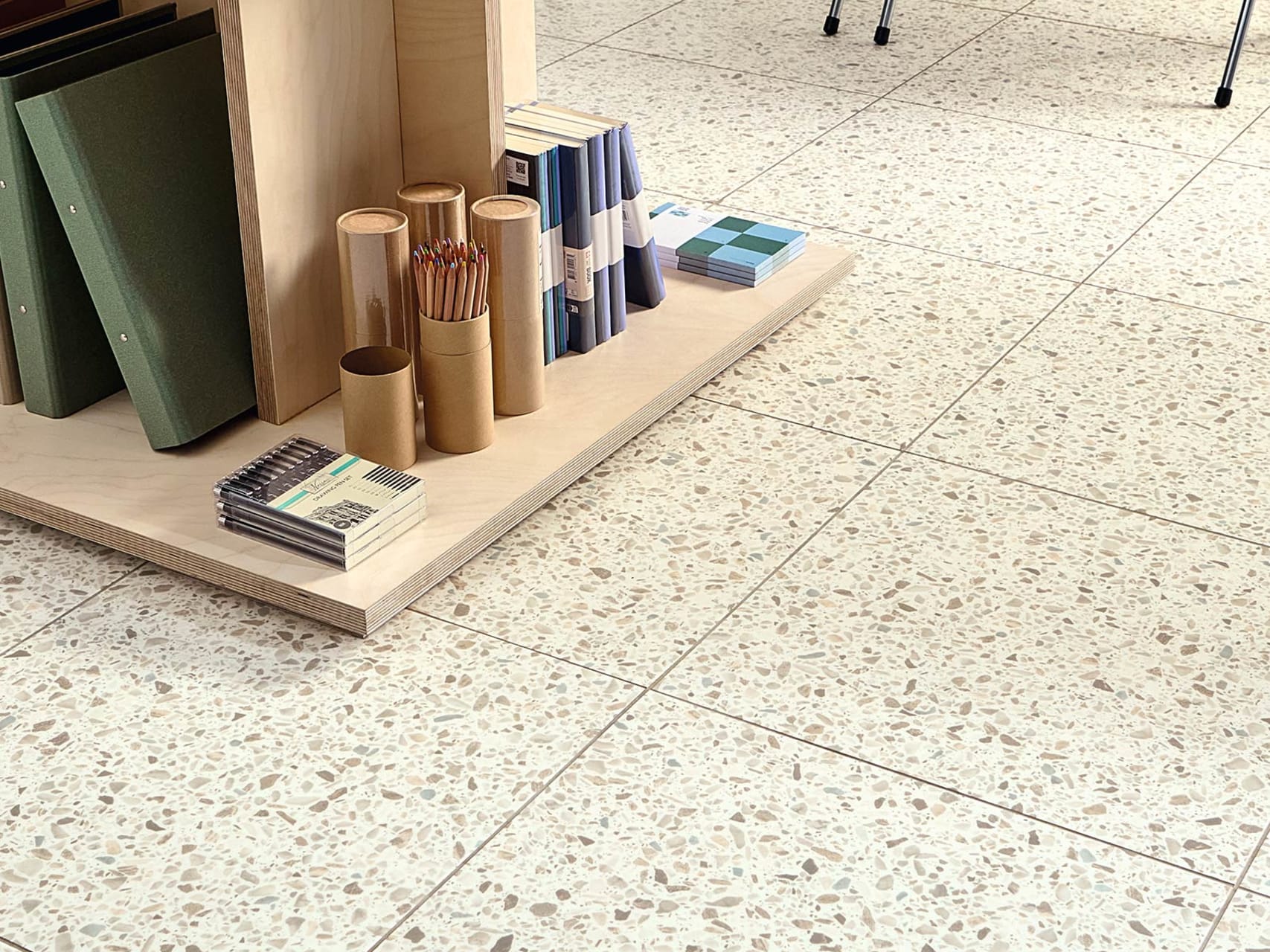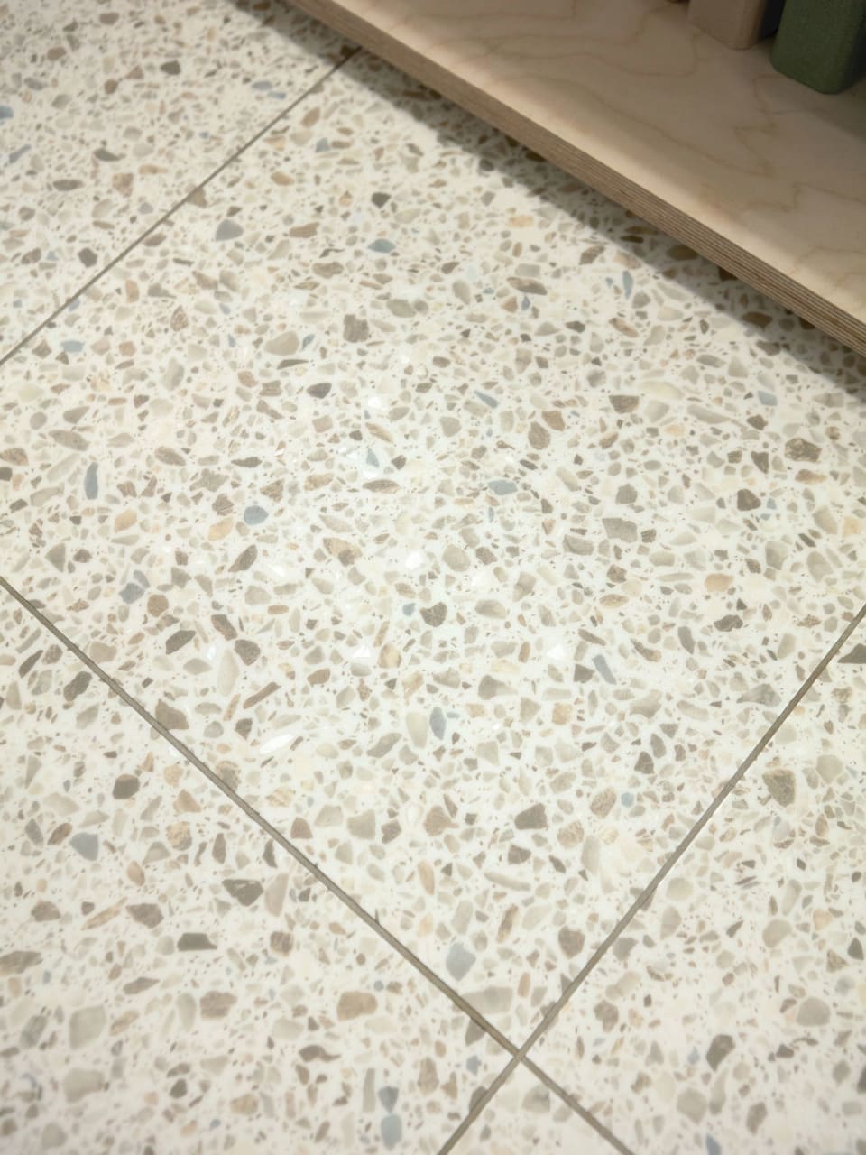 Un sofisticado terrazzo a pequeña escala con delicados fragmentos perlados en suaves tonos azules y neutros, sobre una base crema fresca y luminosa.