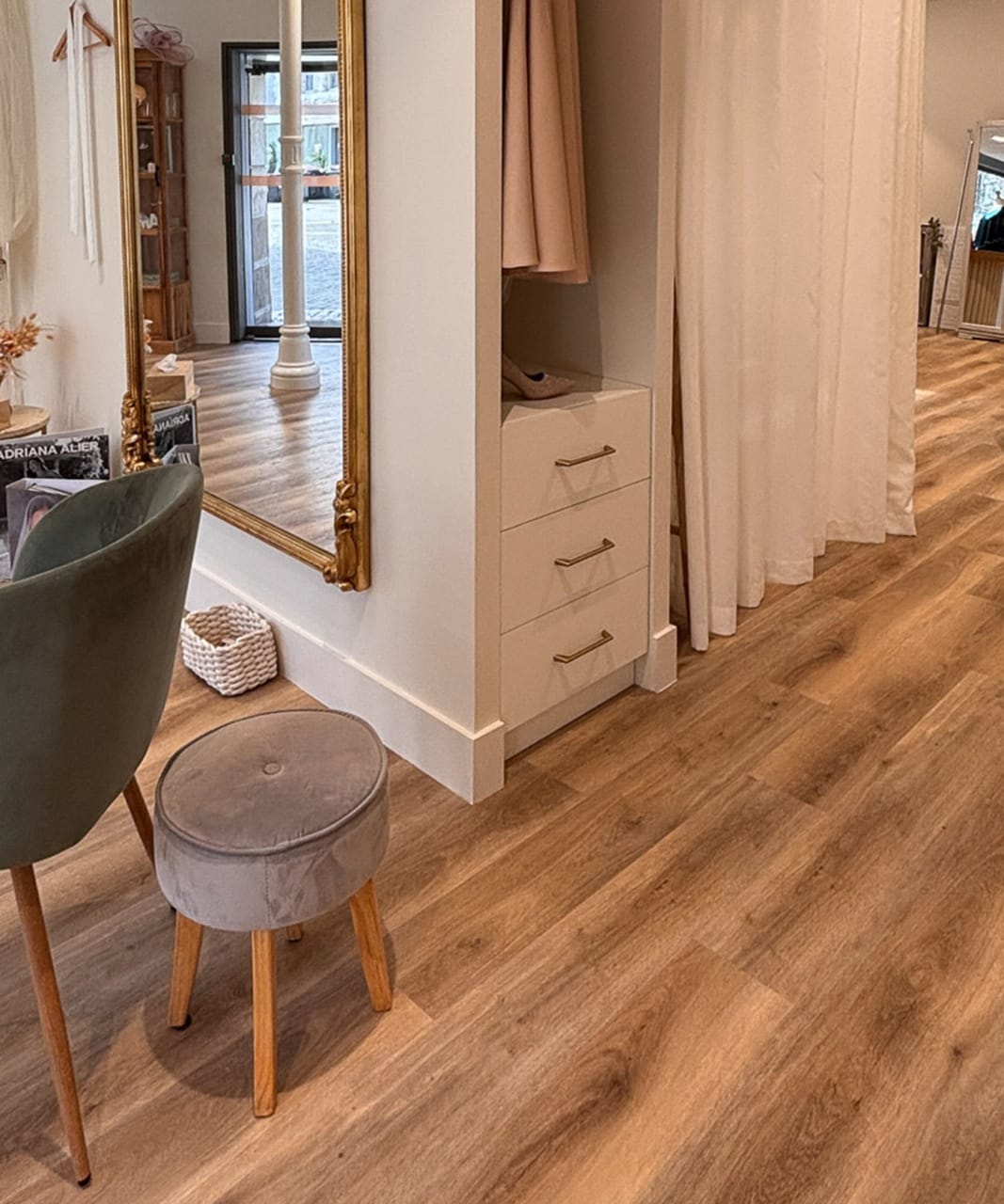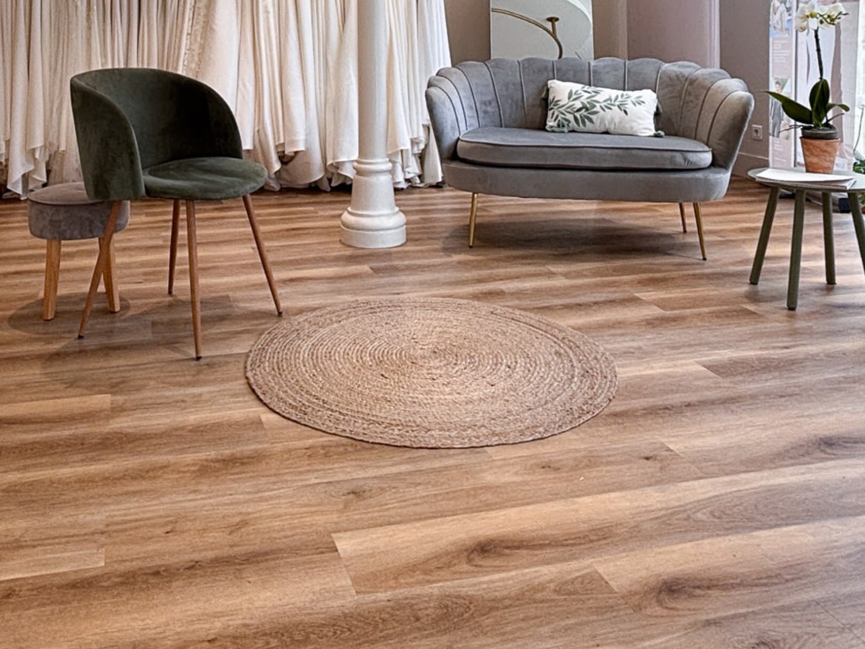 Posé par ACRYLCOLOR, ce sol en LVT allie style sophistiqué et performance, répondant parfaitement aux exigences d’un environnement commercial à fort passage. Il offre une sensation de douceur et de chaleur au sol, idéale pour garantir le bien-être des clientes lors des essayages prolongés.