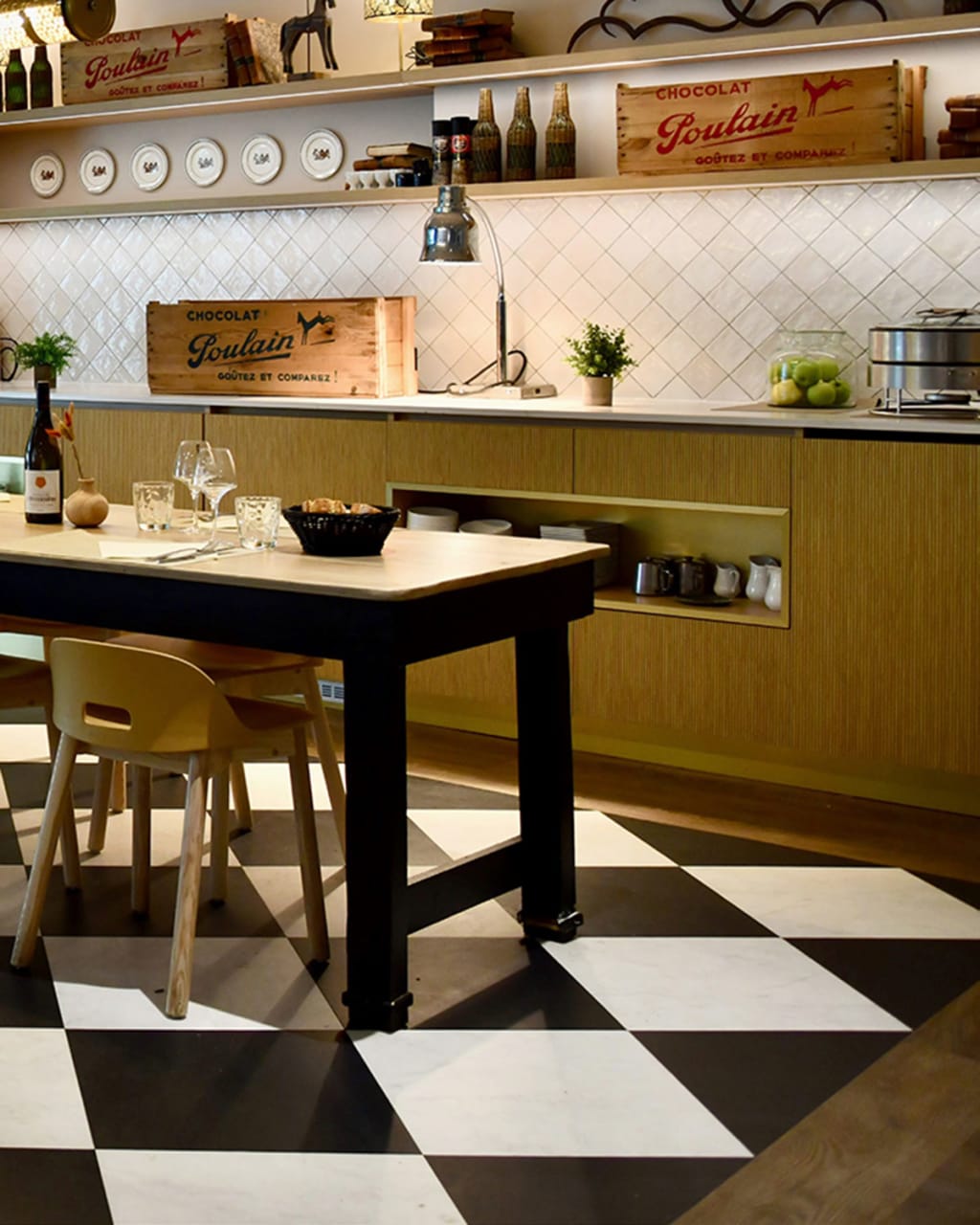 Les espaces de réception et du restaurant donnent le ton sur la rencontre entre l’univers des courses hippiques et le design hôtelier contemporain, avec un motif en Checkerboard noir et blanc saisissant, réalisé avec Amtico Signature, reproduisant parfaitement les drapeaux classiques des courses.