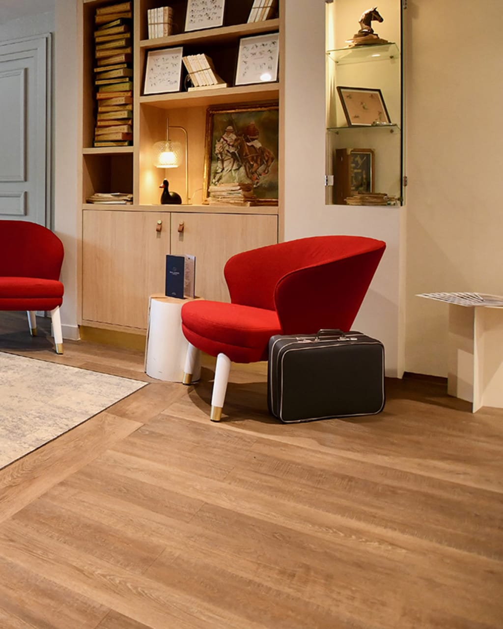 Malthouse Oak s’adapte parfaitement aux espaces calmes et relaxants de l’hôtel, sa variation naturelle de couleurs complétant harmonieusement les assises du lounge aux tons neutres élégants et les touches de rouge des courses, essentielles pour renforcer la forte identité du design.