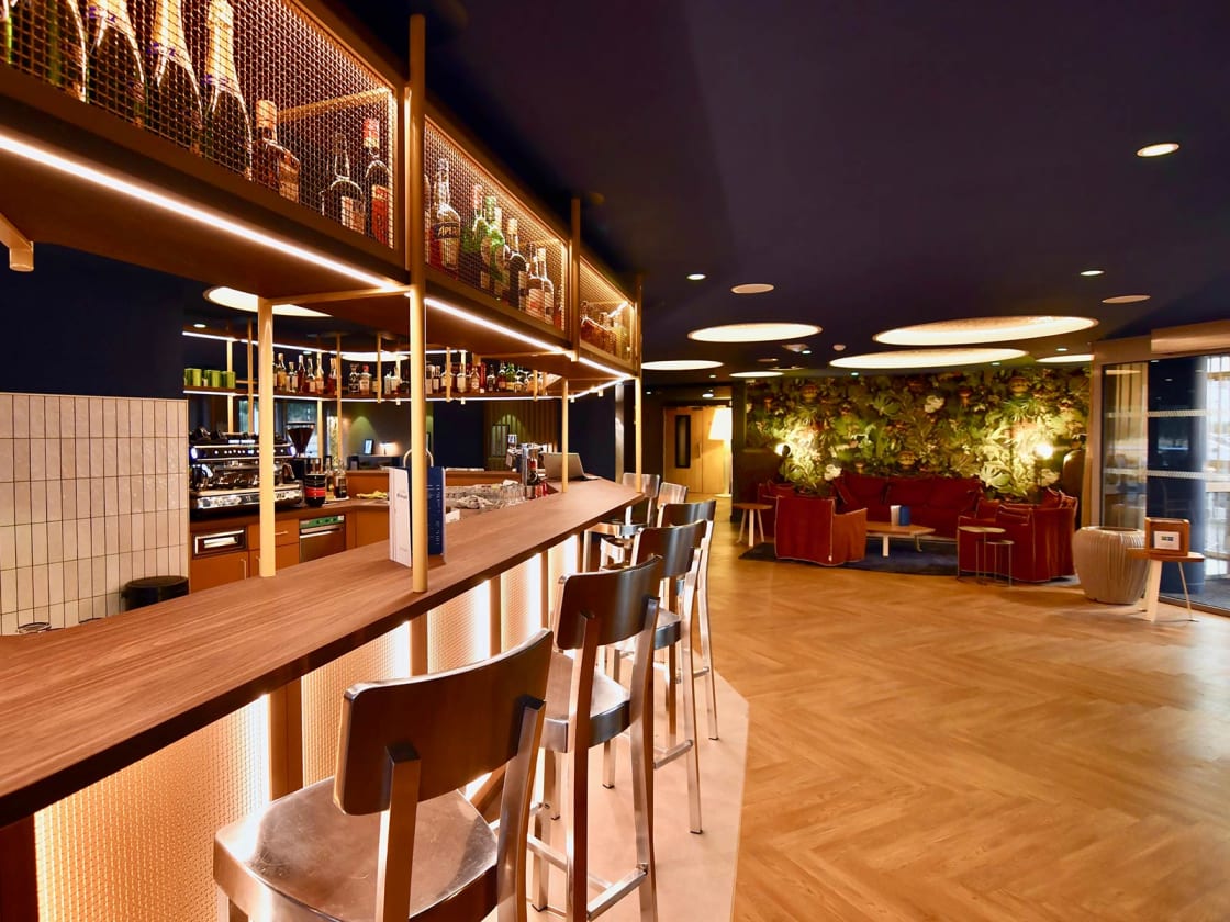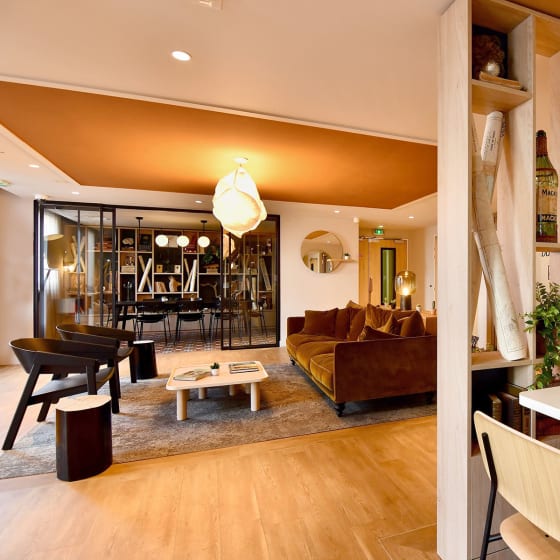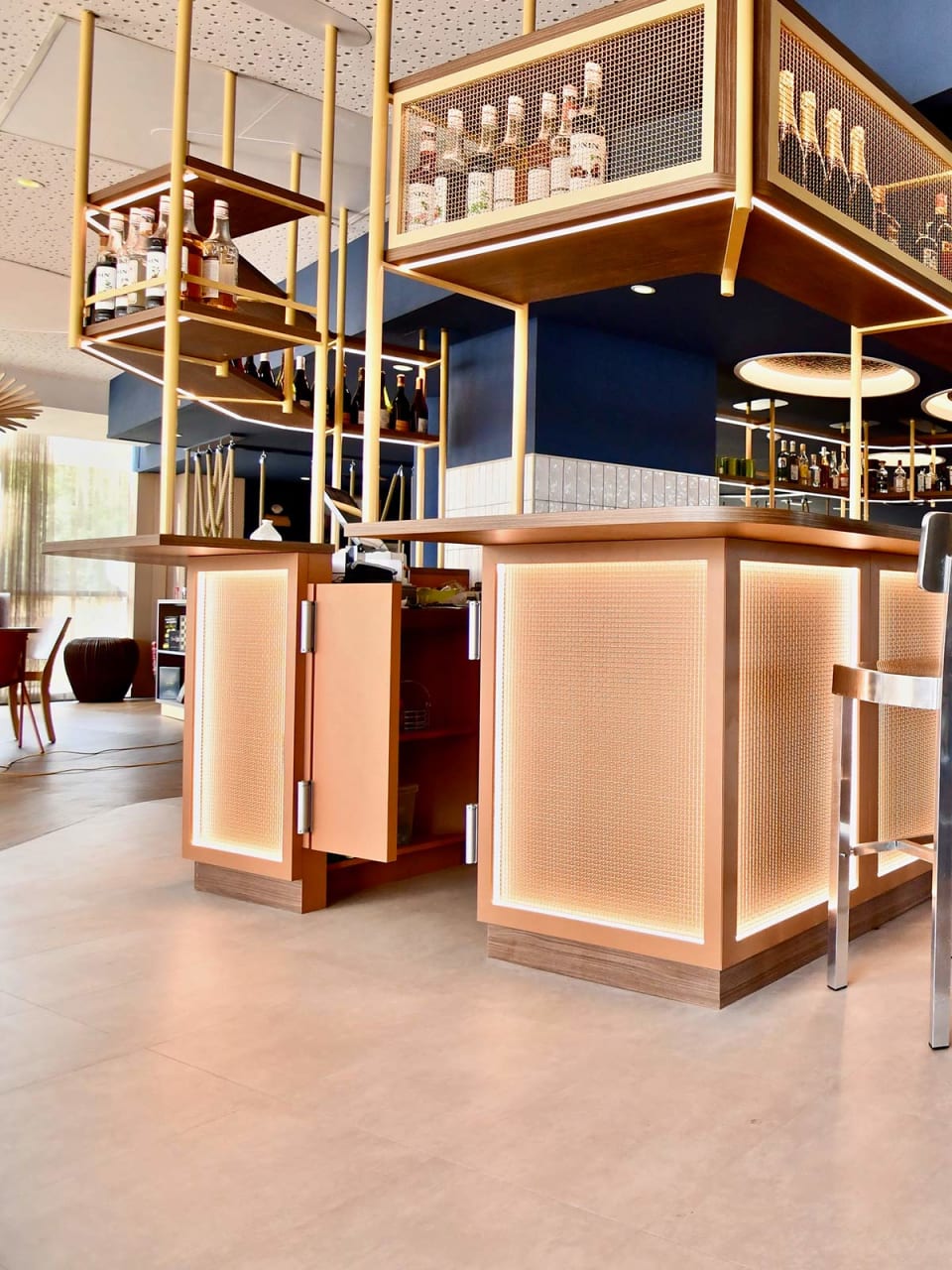 L’objectif : offrir un environnement accueillant, propice à la détente, au travail ou à un repas, dans une ambiance à la fois élégante et naturelle. Grâce à un design intelligent, le sol structure subtilement les différentes zones – bar, salon, restaurant – sans créer de ruptures, offrant ainsi une lecture fluide et intuitive de l’espace. Ce travail de-zoning discret permet un usage continu et harmonieux, parfaitement adapté aux besoins de l’hôtellerie contemporaine.