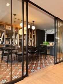 Amtico Décor Goldstone, encadré de bordures Pinstripe, signe les espaces plus confidentiels comme le bar et les salles de réunion, avec élégance et raffinement.