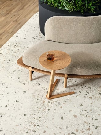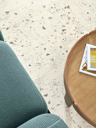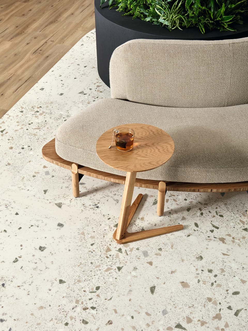 Garda is met zijn mix van groene en bruingele snippers in een frisse basis het favoriete terrazzo om mensen te verbinden met de natuur door natuurlijke elementen op subtiele wijze in te integreren in het interieur. Mooi te combineren met allerlei warme houtnerven.