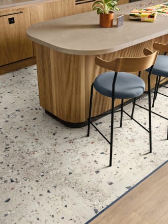Como heeft een zachte, warme crèmekleurige basis geaccentueerd met ongelijkmatig verdeelde marineblauwe en roestbruine snippers van verschillende afmetingen. Een opvallend terrazzo dat kleur geeft aan een interieur.