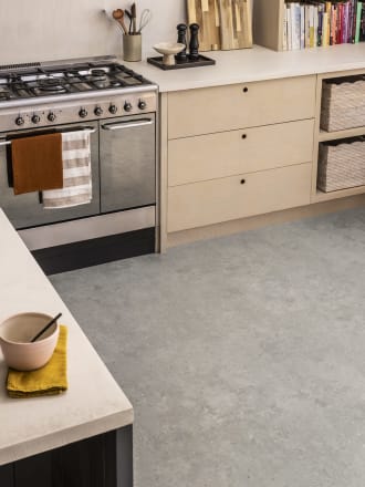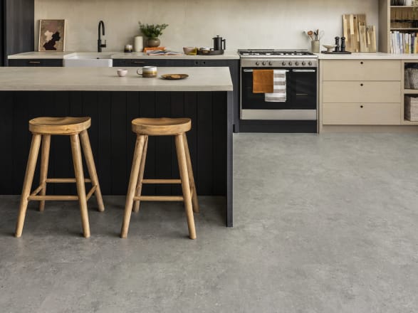 Cementa Bilbao heeft een licht industriële look. Dit eigentijdse middengrijze beton met ingesloten warme natuurlijke steensnippers valt op en combineert goed met allerlei houtnerven.