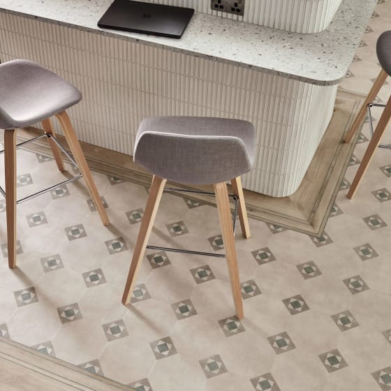 Detta småskaliga mönster med sina oktagonformade plattor är en dekorativ version av det klassiska Key Stone mönstret. Den finns i fyra mycket användbara stenfärger med produkter från premiumkollektionen Signature.