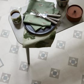 Detta småskaliga mönster med sina oktagonformade plattor är en dekorativ version av det klassiska Key Stone mönstret. Den finns i fyra mycket användbara stenfärger med produkter från premiumkollektionen Signature.