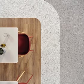 Terrazzo, är helt enkelt det. Den ger alla dekorativa detaljer i det välkända materialet, men med de problemfria installations- och underhållsfördelarna med LVT.
