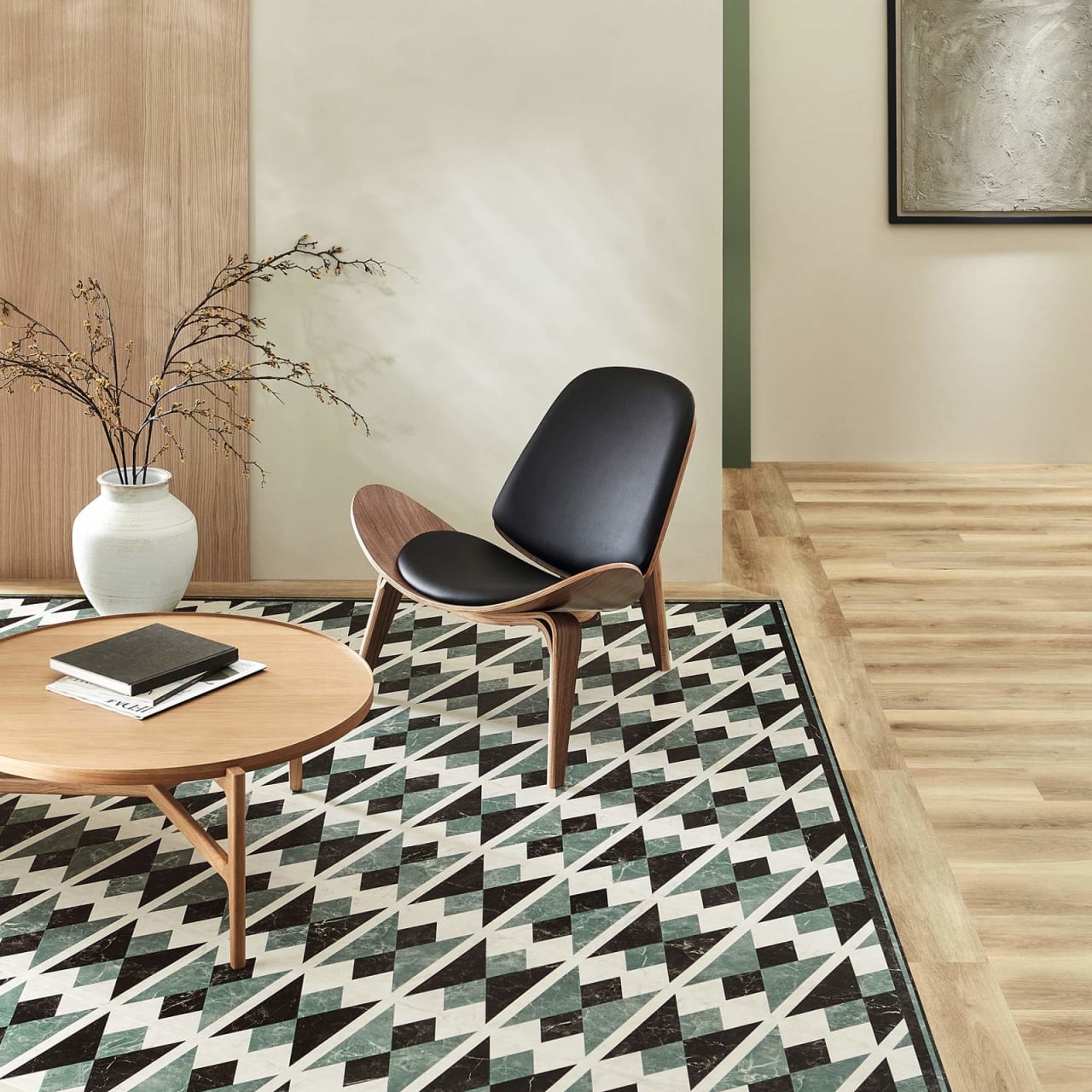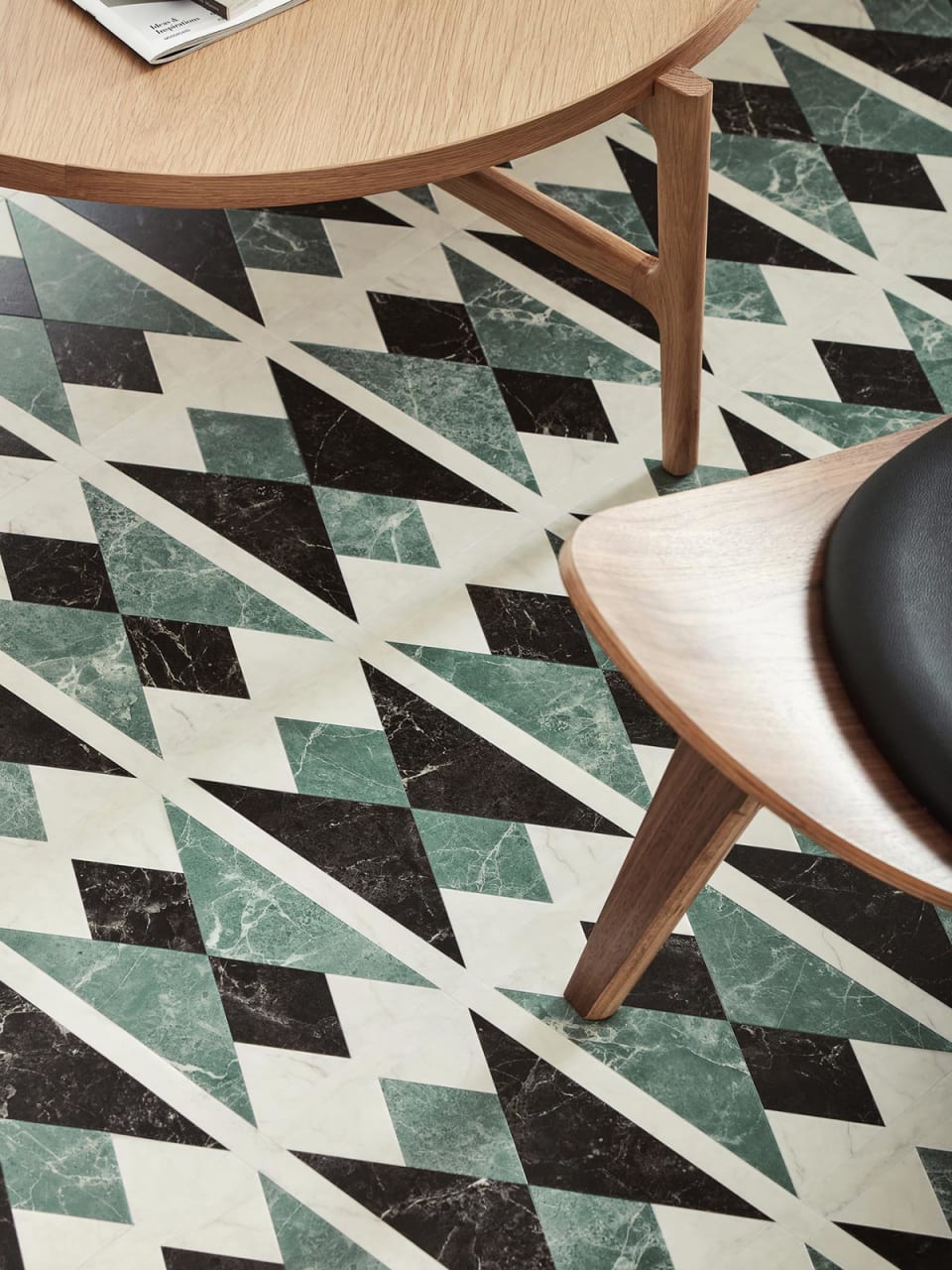 En klassisk svartvit kombination får ett modernt uttryck av en fantastisk, grön marmor. Ett perfekt tillskott i utsmyckade utrymmen.
