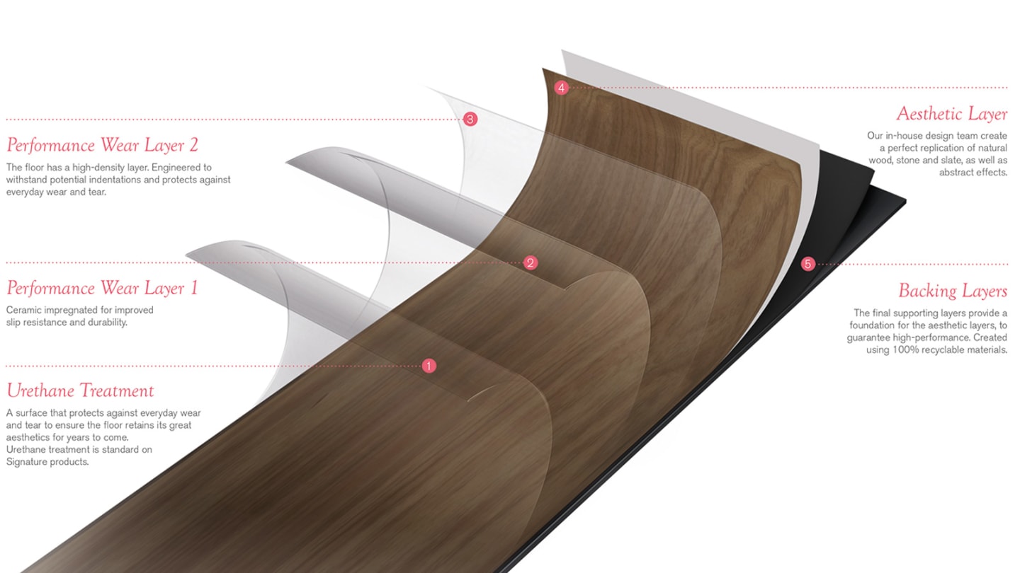 All our LVT floors contain at least five durable layers, to provide the ultimate wear over time.